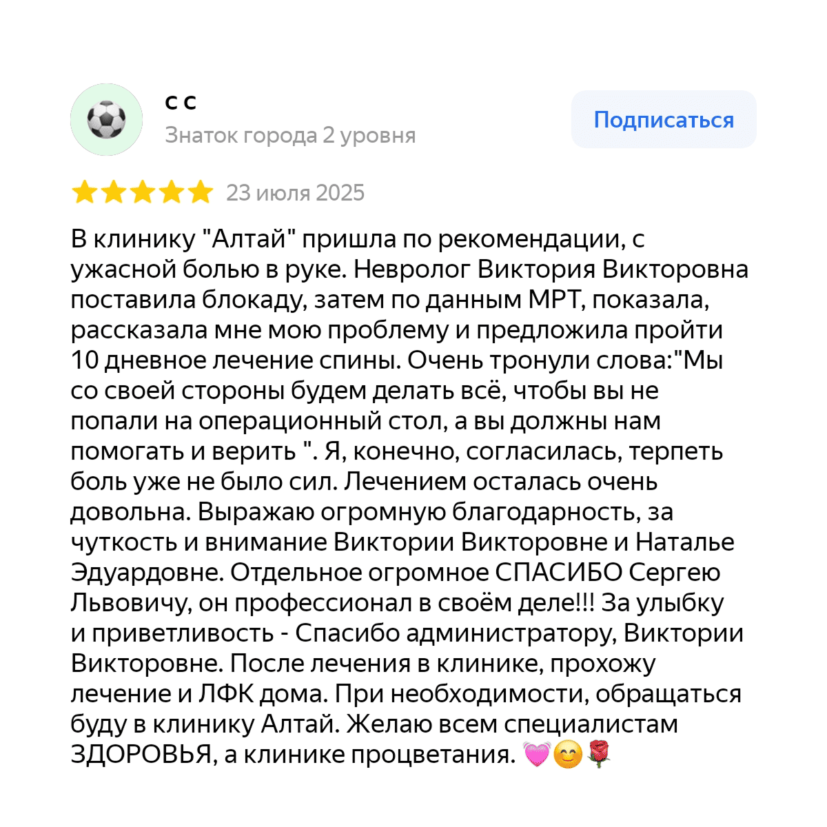 Медицинский центр «Алтай» – это команда высококвалифицированных специалистов: врачей-неврологов, физиотерапевтов, кинезиологов, массажистов-реабилитологов, которые уже более 15 лет помогают людям восстановить функцию суставов и позвоночника. Наша миссия – обеспечить каждому пациенту доступ к эффективной и современной медицинской помощи, чтобы они могли жить полноценной и активной жизнью.